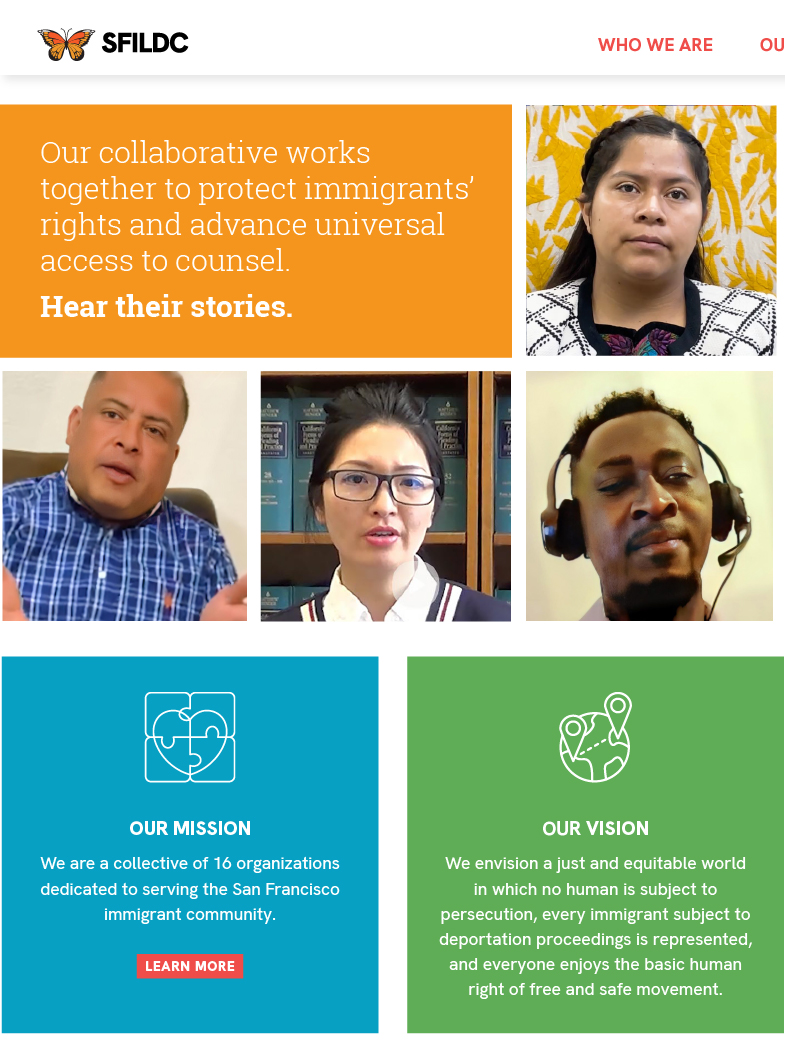SFILDC provides legal representation and support to adults, families, and children in San Francisco facing removal proceedings at San Francisco Immigration Court. We developed a new website for the collaborative, focusing on enhancing engagement with their key constituents: funders, clients, and legislators. The website features a modern, user-friendly interface, allowing easy navigation and accessibility to vital resources. We implemented a responsive design to ensure optimal viewing across devices and a robust content management system that enables the client to update information effortlessly. Tailored sections for each constituent group showcase relevant data, success stories, and funding opportunities while clear calls to action facilitate further engagement. Additionally, we incorporated analytics tools for tracking user interaction and optimizing future outreach strategies.